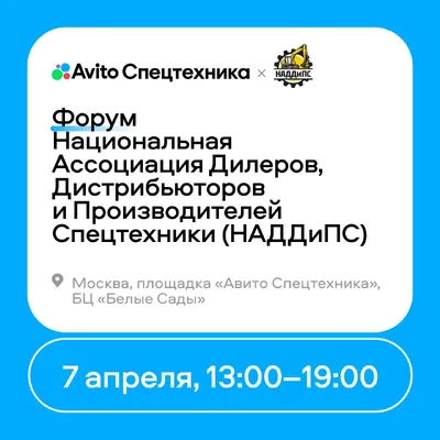 🤍 7 апреля в Москве состоится Форум Национальной Ассоциации Дистрибьюторов, Дилеров и Производителей Спецтехники (НАДДиПС) Стратегический партнёр мероприятия — Авито Спецтехника. Форум объединит кл