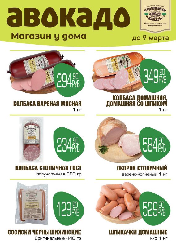 Акции в «Авокадо»🥑 Чернышихинский мясокомбинат - это производство в экологически чистом районе, строгий контроль на каждом этапе и главное - свежее мясо и натуральные специи. До 9 марта в магазина