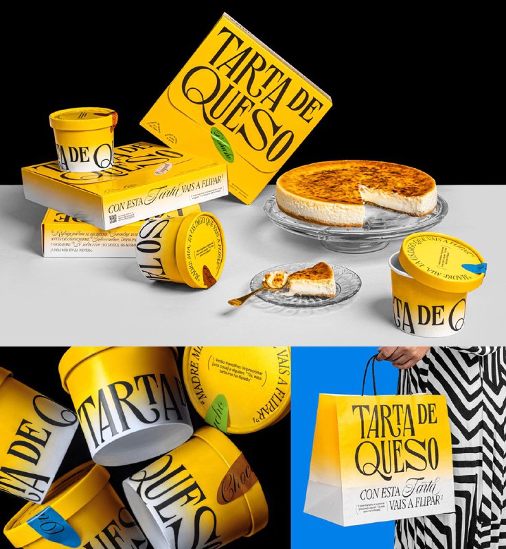 Воздушный, как облачко: упаковки перуанских десертов Tarta De Queso Сочетание элегантных шрифтов и воздушного градиента транслирует изысканность и лёгкость, а яркие стикеры добавляют игривости лакони
