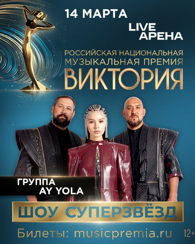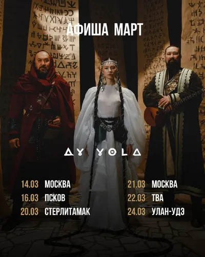 Ближайшие выступления AY YOLA. ▶️ 14.03 Москва Музыкальная премия «Виктория» Подробнее ▶️ 16.03 Псков 52-ой фестиваль русской музыки имени М. П. Мусоргского и Н. А. Римского-Корсакова Подробнее ▶️
