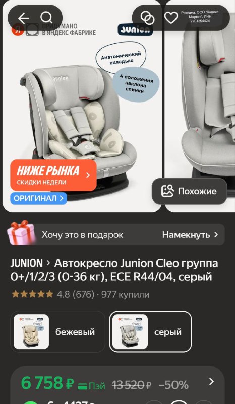 🛒 Яндекс Маркет Автокресло Junion Cleo группа 0+/1/2/3 (0-36 кг), ECE R44/04, серый •BabySale•