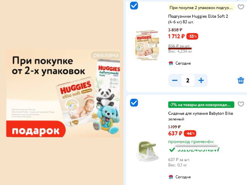 👶 Детский мир При покупке 2 упаковок подгузников или трусиков Huggies —подарок ➡️ Проверяйте персональный промокод ⚠️ Подарки в конце раздела Подписывайтесь на наш канал в MAX или ВКонтакте Рек