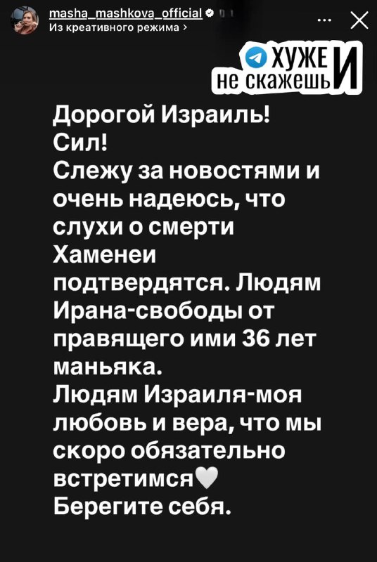 «Привет, дорогой Израиль» Машкова, поддержавшая убийство Хаменеи, не смогла вылететь к своим зрителям в Израиль, поэтому для поднятия их духа надела кофту с надписью «Сила». Потом сказала, что она у