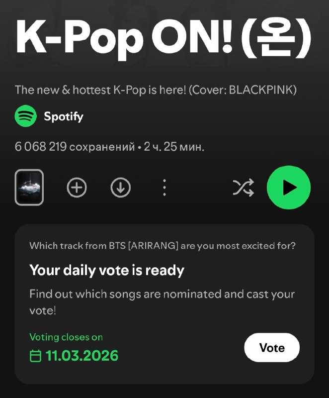🖇 В плейлисте Spotify K-Pop ON! открылось голосование «Какой трек из альбома ARIRANG вы ждете больше всего?». ⏰️ Голосование заканчивается 11 марта Пользователи с премиум-аккаунтом могут отдать 3 г