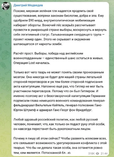«Потасканная *, мерзкая зелёная тля, Гитлер, вонючий пёс и шатающийся от наркоты зомби» Медведев литературным русским языком прокомментировал своё отношение к Зеленскому после выдачи Украине кредита