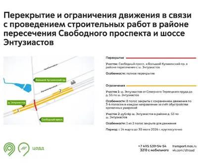 ⚡️ С 14 марта до 30 июля участки Свободного проспекта и Большого Купавенского проезда будут закрыты для движения. Это связано с проведением строительных работ. В тот же период на участках шоссе Энтузи