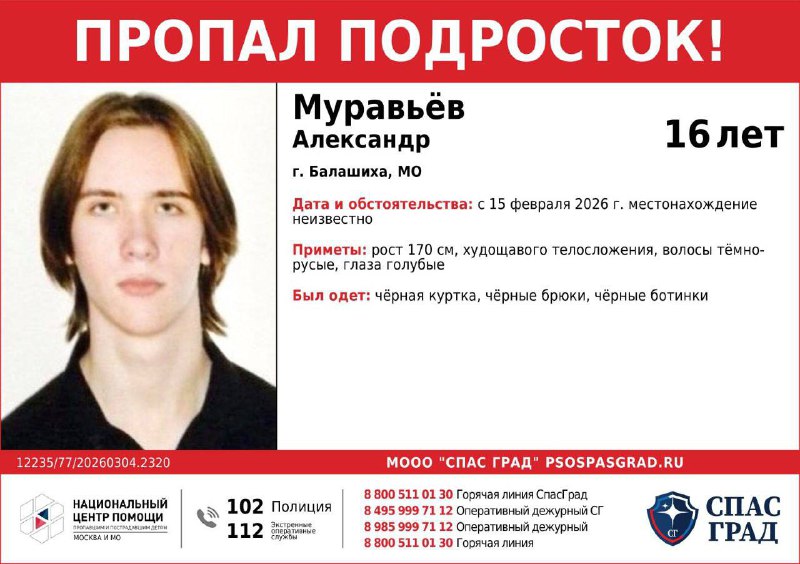 🔴 Пропал подросток Александр Муравьев, город Балашиха. Если видели — срочно сообщите в полицию. Плохо грузит Telegram? Читай в МАХ 📲