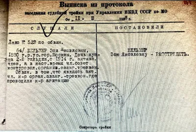 16 марта 1938 г. на Бутовском полигоне приведен в исполнение приговор о расстреле: Бельмер Зоя Яковлевна (1880 - 1938) — из купеческой семьи, делопроизводитель религиозных общин (с 1926 г. община ева