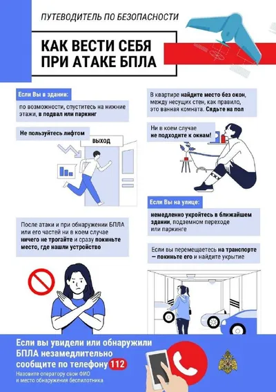 ⚡️ Уважаемые жители! Напоминаем правила поведения при атаке БПЛА. ▶️ Если в момент нападения БПЛА люди находятся в здании, специалисты рекомендуют им спуститься на самые нижние этажи или в подвал.