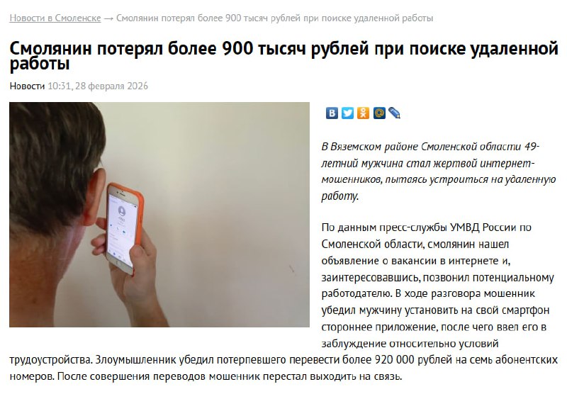 Смолянин потерял более 900 тысяч рублей при поиске удаленной работы По данным пресс-службы УМВД России по Смоленской области, смолянин нашел объявление о вакансии в интернете и, заинтересовавшись, по