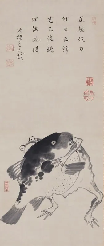 "Лягушка и рыба-фугу, занимающиеся сумо" художника Ито Дзякутю. Эпоха Эдо, XVIII в., Япония.