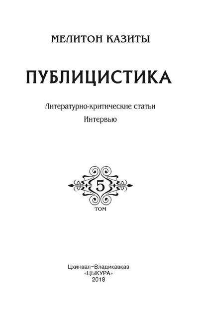 Мелитон Казиты. Собрание сочинений в пяти томах. Том 5. Публицистика (Литературно-критические статьи. Интервью). 2018 г. В книгу вошли обзорные и литературно-критические статьи, рецензии и интервью и