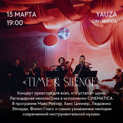 YAUZA 15 марта / Cinematica Orchestra: Time & Silence Этот вечер посвящен замедлению и внутренней тишине. Погрузимся внутрь себя в поисках гармонии под композиции Макса Рихтера, Ханса Циммера, Лю