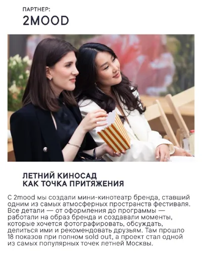 Как партнёрства делают фестиваль масштабнее, а зрительский опыт — глубже? Сейчас расскажем! Превращать партнерство с брендами в полноценную коллаборацию — наша сильная сторона уже больше 10 лет. Вме
