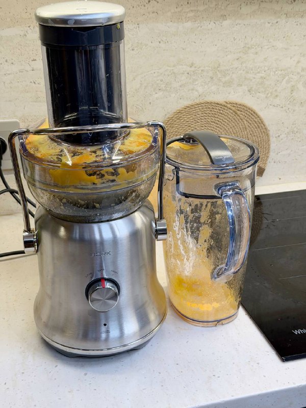 Верным решением была покупка этого огромного монстра от Bork. Очень мощная соковыжималка, расправляется с большой морковкой за секунду. Мои любимые соки: 🍍Чистый ананас 🥭Чистый манго 🥭Ананас, манго
