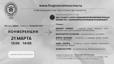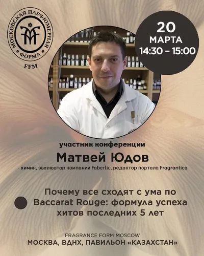 20 марта на конференции “Московская парфюмерная форма» 14:30 – 15:00 | Почему все сходят с ума по Baccarat Rouge: формула успеха хитов последних 5 лет Как парфюмерному бестселлеру удается удерживать