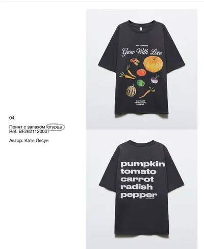 Видимо, мир понял, что запах огурца — это мастхэв. Befree выпустили футболки с ароматизированными принтами: «потри его, чтобы почувствовать запах. Выдерживает до 20 стирок». Среди ароматов арбуза, орх