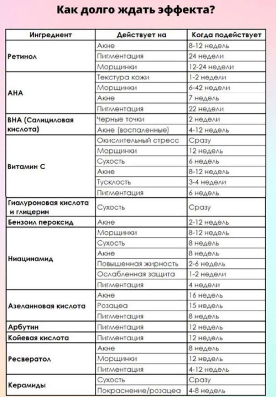 Итак вы купили себе ретинол, пептиды, спф, но эффект не заметен. Почему так может быть? 1. Короткий срок применения Вот тут я публиковала табличку, где указано, сколько необходимо использовать каж