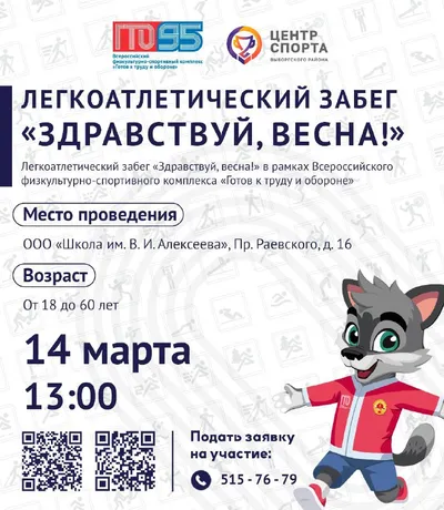 🏃♀️ Л/А забег "Здравствуй, весна!" 📆 Дата проведения: 14.03.2026 📍 Место проведения: 🛡 Санкт-Петербург, пр. Раевского, д. 16 (СК им. В.И. Алексеева) 🏃♀️ Дистанция: 3 км ⏰ Программа мероприя