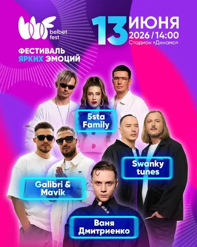 Музыкаbelbet fest — фестиваль ярких эмоций! Здесь всё о главном open-air этого лета: 🎤 узнаешь лайн-ап самым первым; 😲 услышишь эксклюзивные инсайды; ⭐️ получишь самую свежую и точную информацию. Увидимся 13 июня на стадионе «Динамо»! Сайт: fest.belbet.by