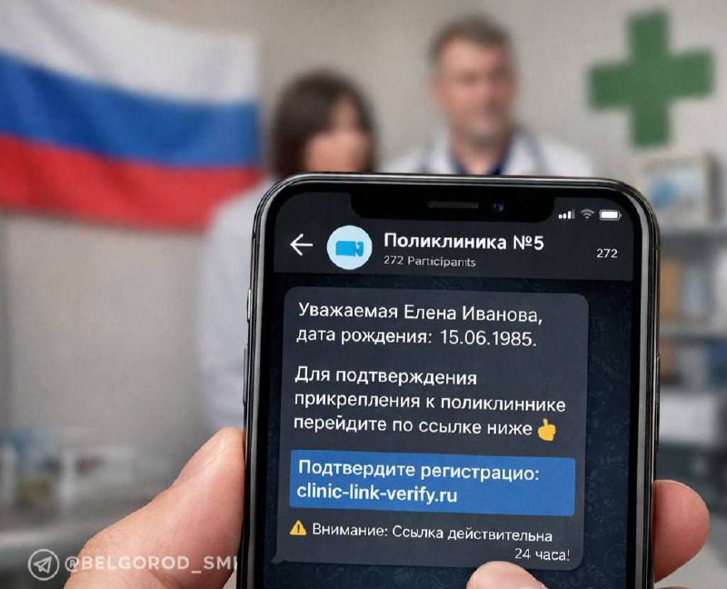 ❗️Россиян массово добавляют в фейковые «чаты поликлиник» В сообщениях указывают реальные ФИО и дату рождения жертвы, после чего просят перейти по ссылке для «подтверждения прикрепления к поликлинике»