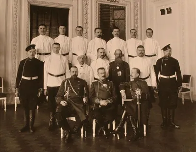 В офицерском собрании Лейб-гвардии Преображенского полка. 1900 г. В первом ряду слева направо: поручик герцог Н.Н. Лейхтенбергский (1868-1928), штабс-капитан барон А.Л. Зедделер (1868-1924), поручик