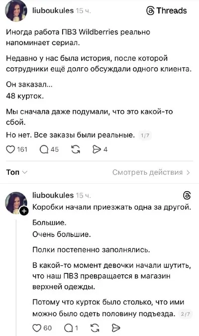«ПВЗ иногда бол��ше похож на пункт возврата, чем на пункт выдачи» Один покупатель зачем-то заказал на маркетплейсе сразу 48 курток, которые заняли весь пункт выдачи. Когда мужчина наконец пришёл за н