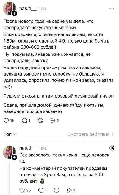 «Хрен вам, а не ёлка за 500 рублей» Продавец на Ozon нашёл способ проучить покупателей, которые после Нового года пытаются урвать искусственную ёлку по максимально низкой цене. Вместо ожидаемого ново