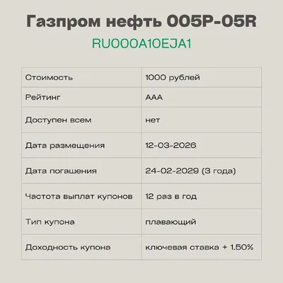 ✅ Газпром нефть 005P-05R — RU000A10EJA1 Газпром нефть входит в тройку крупнейших компаний в России по объему добычи и переработки нефти, занимается разведкой месторождений нефти и газа в ключевых рег