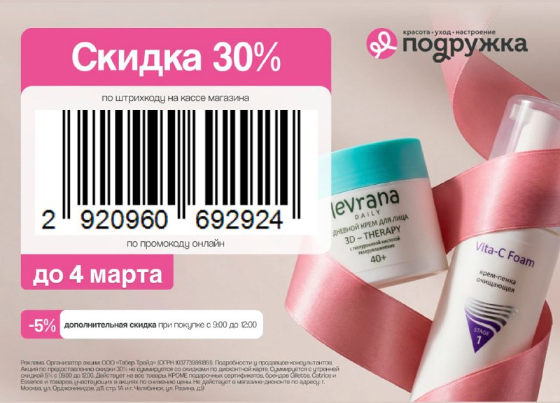 Скидка до 35% в Подружке! Получите скидку 30% при покупке без минимальной суммы чека магазинах Подружка только с 2 по 4 марта! 🔥 👉 Для получения скидки покажите на кассе штрих-код по ссылке https