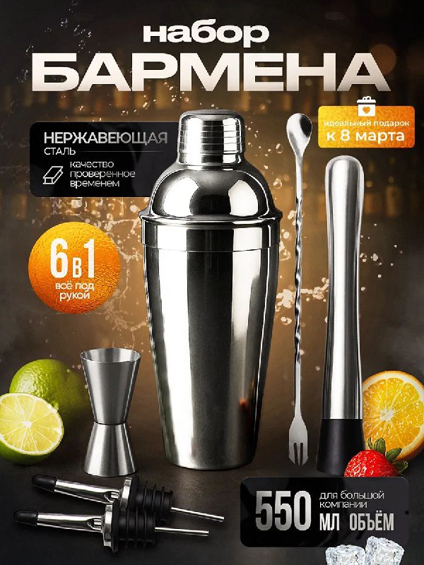 🎁Набор бармена с шейкером — создайте свой идеальный коктейль! В комплекте: ✔️ шейкер, ✔️ джиггер, ✔️ барная ложка, ✔️ мадлер, ✔️ 2 гейзера. Прочный, стильный, из нержавеющей стали. Идеально в п