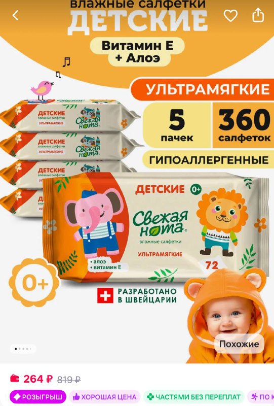🔥🔥🔥🔥🔥 🔥Влажные детские салфетки Витамин Е 5уп х72 360 шт 🔥 https://www.wildberries.ru/catalog/161474591/detail.aspx?size=268255140