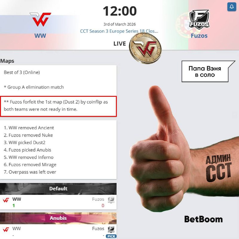 StRoGo случайно выиграл карту, а потом и матч 😁 Обе команды опоздали на игру, поэтому админы CCT бросили монетку 🖥 А позже выяснилось, что у соперников не полный состав, и серия фулл досталась WW T