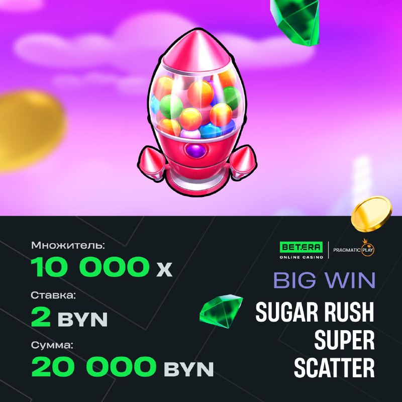 Продолжаем наш секундный марафон 🙃 Наш пользователь выиграл аж 20 000 BYN в новинке от Pragmatic Play – Sugar Rush Super Scatter. У пользователя была включена ставка-анте на х10 шанс выпадения бону