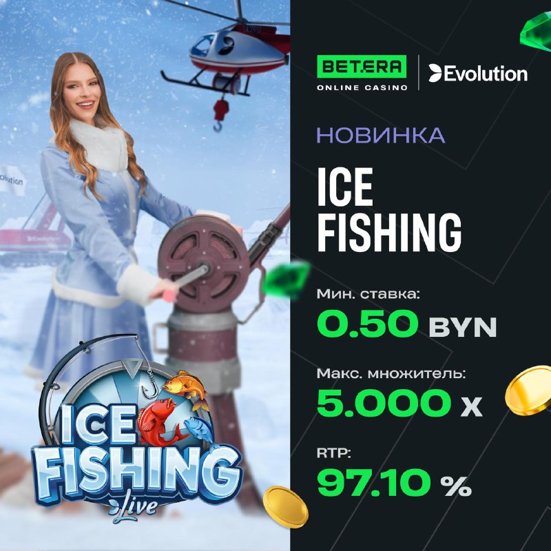 Новинка от Evolution 🎣 Встречайте – Ice Fishing! В центре игры находится виртуальное денежное колесо, состоящее из 53 сегментов. На нем расположены секторы с мгновенными выигрышами и тремя вариантам