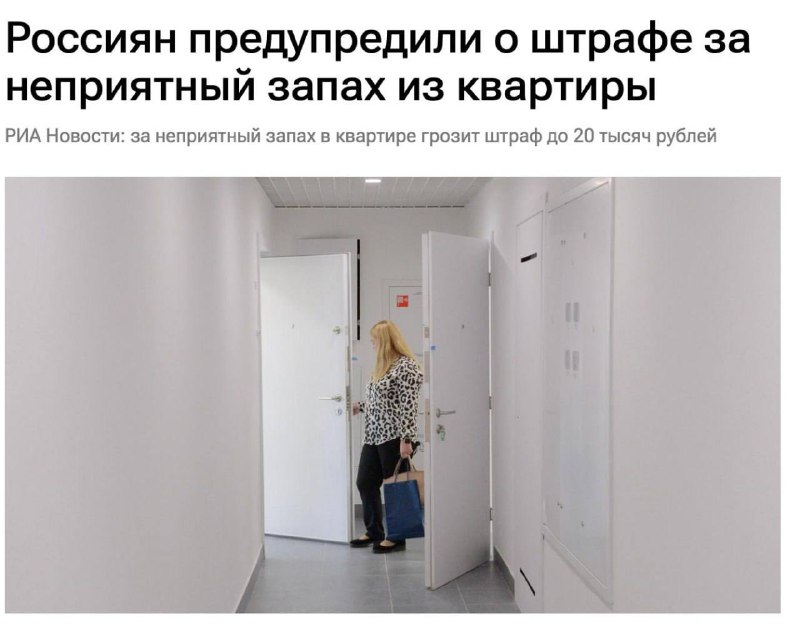 ❌ Россиян будут штрафовать до 20 тысяч рублей за неприятные запахи из квартиры, предупреждают эксперты Причиной запахов могут быть содержание животных без надлежащего ухода, отсутствие уборки, несвое