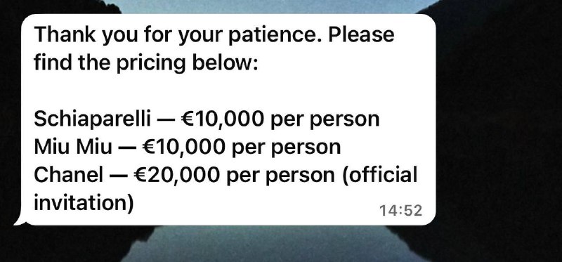 Расценки на приглашения на показы Парижской недели моды выложил аккаунт некоего сервиса Hospitality Group, о котором мне рассказывал Виталий Плисов в Подкасте о путях построения карьеры в международно
