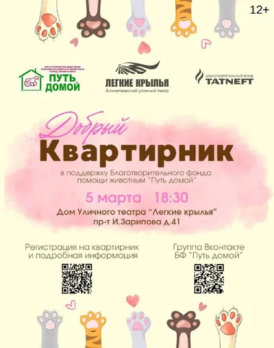 🐾 5 марта в Альметьевске пройдет благотворительный «Добрый квартирник» в поддержку фонда помощи животным «Путь домой» Мероприятие организует уличный театр «Лёгкие крылья» — проект Благотворительного
