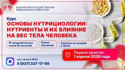 Приглашаем на обучающий курс "Основы нутрициологии: нутриенты и их влияние на вес тела человека" 16 академических часов, 6 занятий 🔔Старт 1 апреля Занятия будут проводиться по средам с 18:00 По о