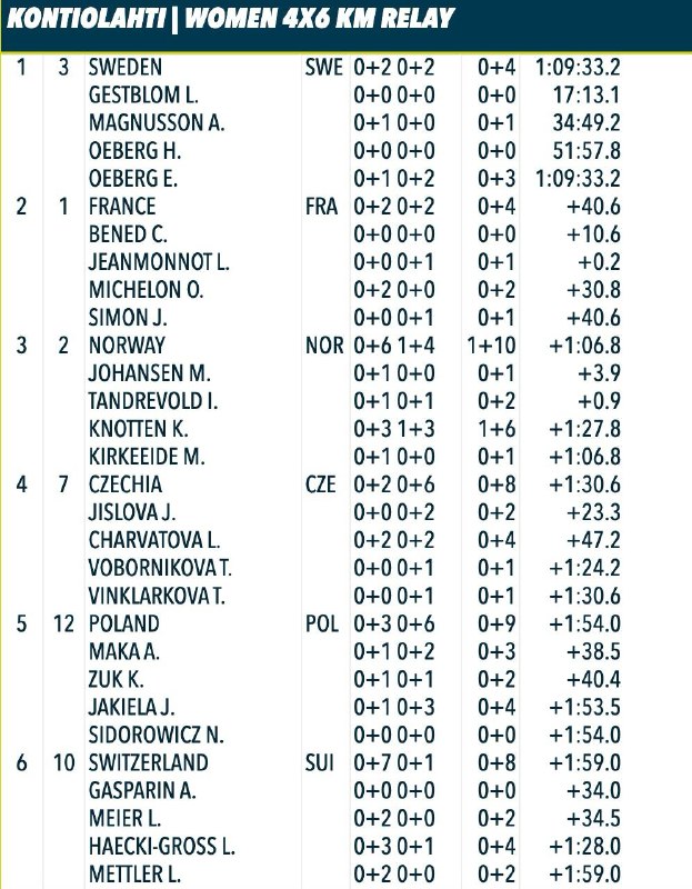 🌎 Шведки выиграли женскую эстафету на этапе Кубка мира в Контиолахти. Золото в мужском масс-старте взял Легрейд Эстафета. Женщины: 🥇 Швеция (Линн Гестблом, Анна Магнуссон, Ханна Эберг, Эльвира Эбер