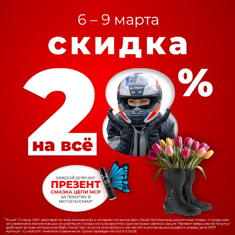 Праздник в Байк Ленд — скидки –28% на всё!* 💐 Порадуйте себя или близких: с 6 по 9 марта во всех мотосалонах и интернет‑магазине Байк Ленд — грандиозная распродажа! Мотоэкипировка, аксессуары и за