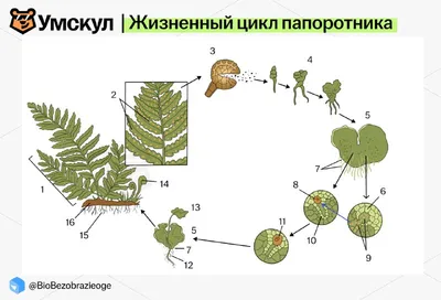Первая картинка этой недели — жизненный цикл папоротника 1 — вайя 2 — сорусы 3 — спорангий со спорами 4 — развивающийся гаметофит 5 — заросток 6 — антеридий 7 — ризоиды 8 — яйцеклетка 9 — сперматозо
