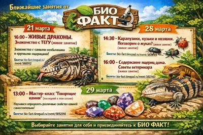 Ближайшие занятия от БИО ФАКТ 2️⃣1️⃣ марта 🐲 16:00 - ЖИВЫЕ ДРАКОНЫ. Знакомство с ТЕГУ (живое занятие) Знакомство с самыми необычными и крупными ящерицами! Билеты -https://bio-fact.timepad.ru/ev