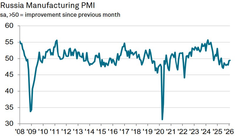 🇷🇺Российская промышленность — сигналы стагнации В феврале индекс обрабатывающей промышленности PMI (выборочные опросы предприятий) вырос до уровня 49,5 (декабрь: 49,4). Значение ниже 50 означает со