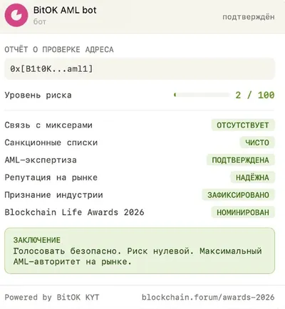 🏆 BitOK номинирован на Blockchain Life Awards 2026 Если вы проверяете адреса, отслеживаете риски или просто следите за нашим контентом — поддержите нас и отдайте свой голос за BitOK. ✅ Голосуйте з