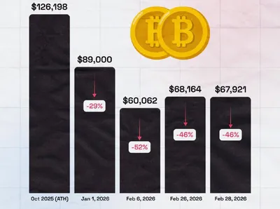 💰 Вспомним октябрь 2025, когда курс BTC взлетел до $126,198 — за 4 месяцев снижение на ~46%. Ранее: 👑 Циклы и рост Биткоина. Bits.media