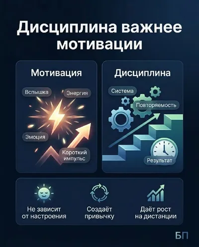 🔥 Почему дисциплина важнее мотивации Мотивация — вещь приятная. Когда она есть, кажется, что сейчас свернёшь горы, запустишь новый проект, наведёшь порядок в задачах и наконец выйдешь на новый уро