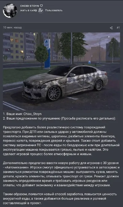 😷 Один из игроков на форуме предложил вернуть старую механику повреждений автомобиля, которая ранее была удалена. 🚘 Как думаете, надо ли? ❤️ - да, было бы супер 👎 - ой не, не нужно 🔹Предложить Н