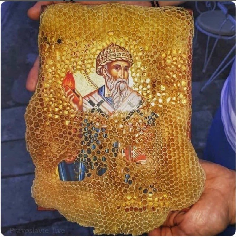 ⚜️ Пчёлы вновь украсили икону святителя Спиридона воском. Ни разу ещё не случалось, чтобы пчёлы оплели воском лик святого. Вся икона может быть оплетена воском спереди и сзади, но лик всегда остаётся