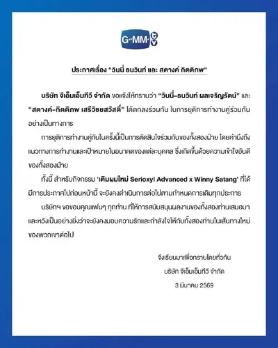компания GMMTV выпустила заявление, что Винни и Сатан превращают свою совместную деятельность как пара объявление о «Винни Танавине и Сатанге Киттипхопе» компания GMMTV Co., Ltd. сообщает, что Винни